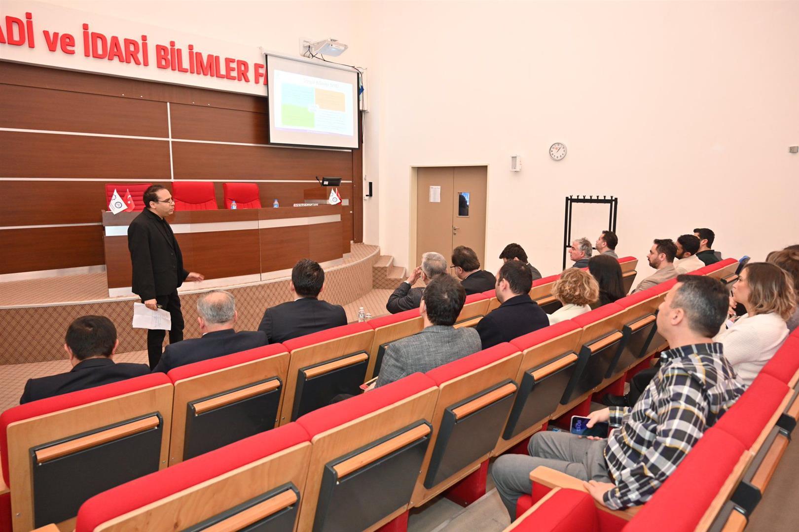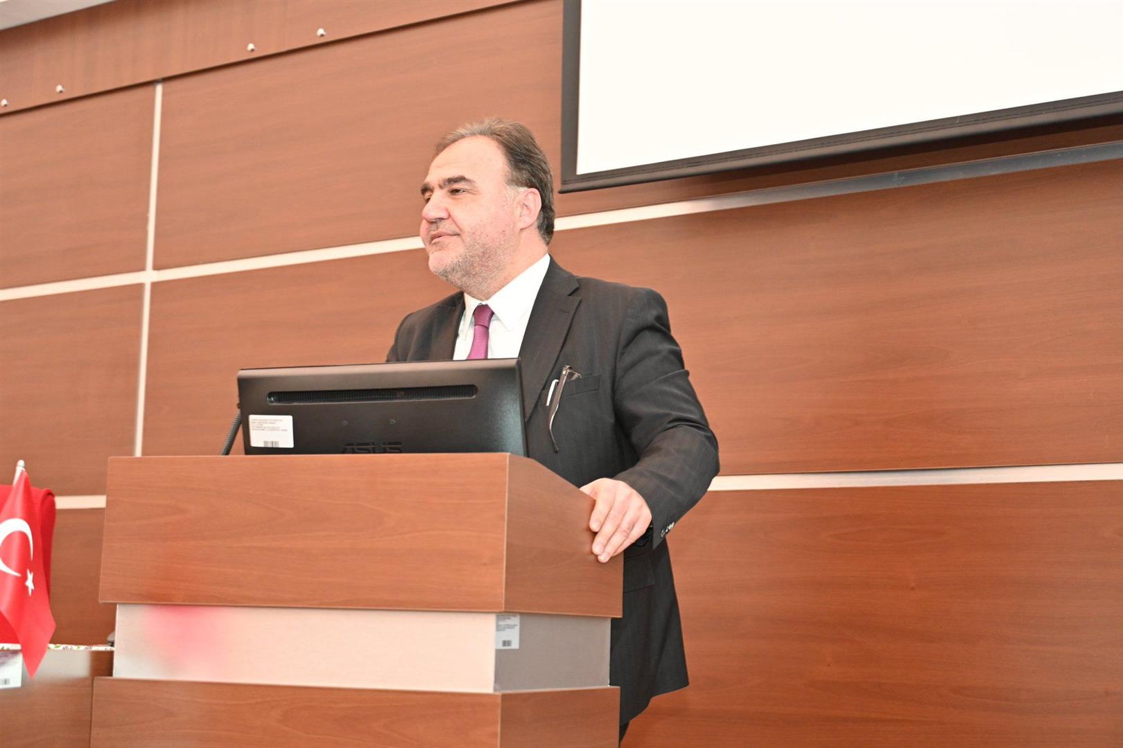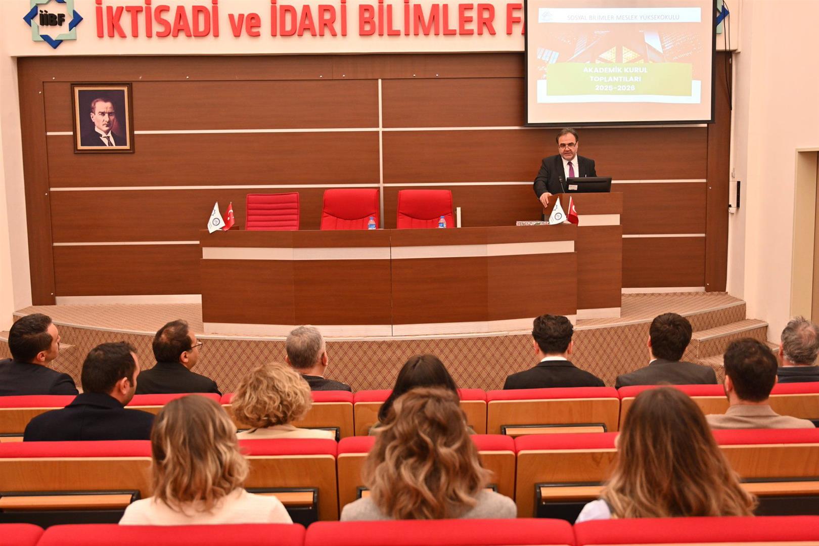 Toplantıda, Sosyal Bilimler Meslek Yüksekokulu Müdürü Sayın Prof. Dr. Barış Öztuna, birimin mevcut durumu, akademik performansı ve gelecek projeksiyonlarını içeren kapsamlı bir sunum gerçekleştirdi.